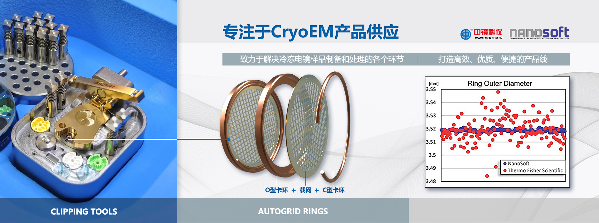 NanoSoft的Autogrid Rings是一種優質的、變化較小的、功能相當的選擇,可用于賽默飛的cryoEMs和自動裝填系統。采用尖端技術制造,可降低載網的變形。高質量的卡環與賽默飛TFS版本的同款產品相兼容。